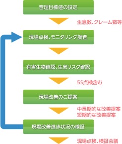 ミヤコ消毒では、害虫等による被害が許容できないレベルを逸脱しない管理目標値を設定し、その目標値をクリアするための正確なモニタリング調査及びそれに伴った構造改善、清掃方法改善等をご提案させて頂きます。