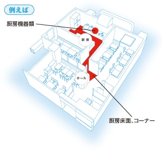 床面や壁面などに速効性・残効性を兼ね備えた薬剤を散布する従来の施工方法です。残効性があるため、ゴキブリ予防施工にもお勧めします。