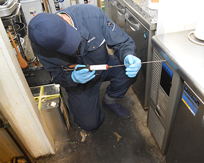 ゴキブリにベイト剤(薬餌)を食べさせ、ドミノ式に駆除します。環境に配慮した方法で、後片付けの手間がかかりません。 プロの調査技術で予想外の潜伏場所も暴き、確実にベイト剤を食わせます!