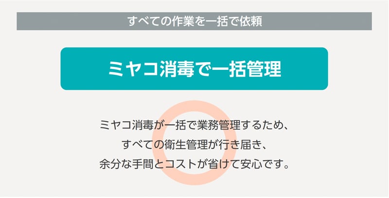 ミヤコ消毒では衛生検査から清掃、メンテナンスまで作業を一括管理いたします。また、お客様からしっかりヒアリング することを重視しており、お客様の「お取り組み」パートナーとして衛生管理を行って参ります。