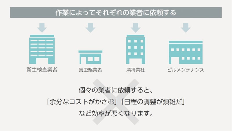 単なる「お取引」業者ではなく、お客様との「お取り組み」パートナーとして、衛生管理のコンサルティング(提起・対策・実行)を行っていきたいと思っております。